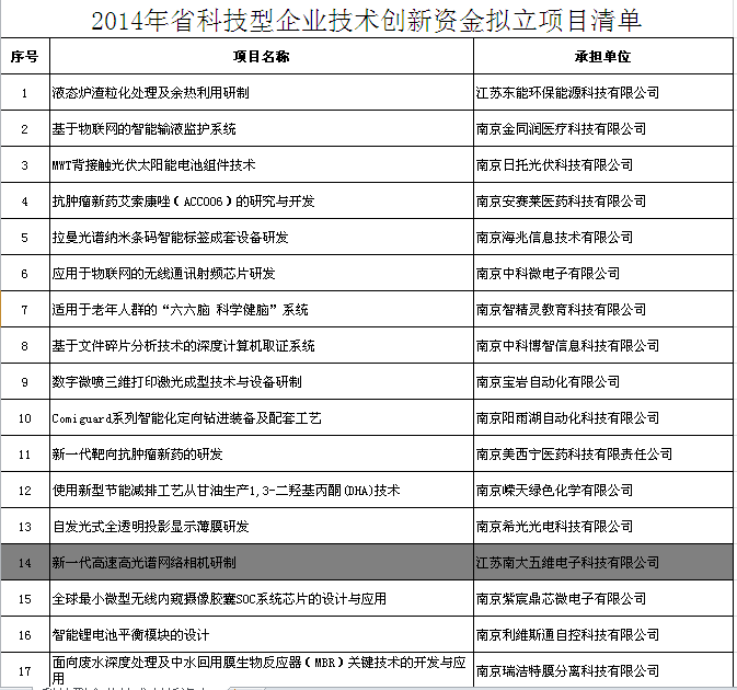 2014年5月16日,江蘇省科技廳公示2014年江蘇省科技型企業(yè)技術(shù)創(chuàng)新資金擬立項(xiàng)目清單,公司《新一代高速高光譜網(wǎng)絡(luò)相機(jī)》項(xiàng)目入選。
